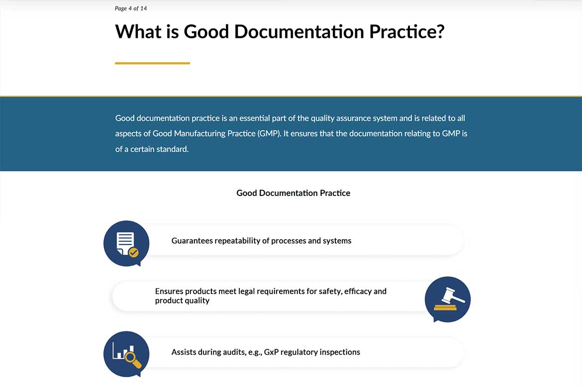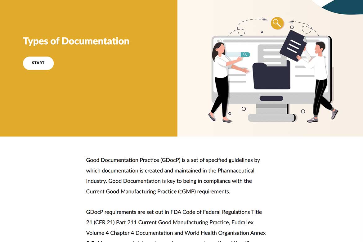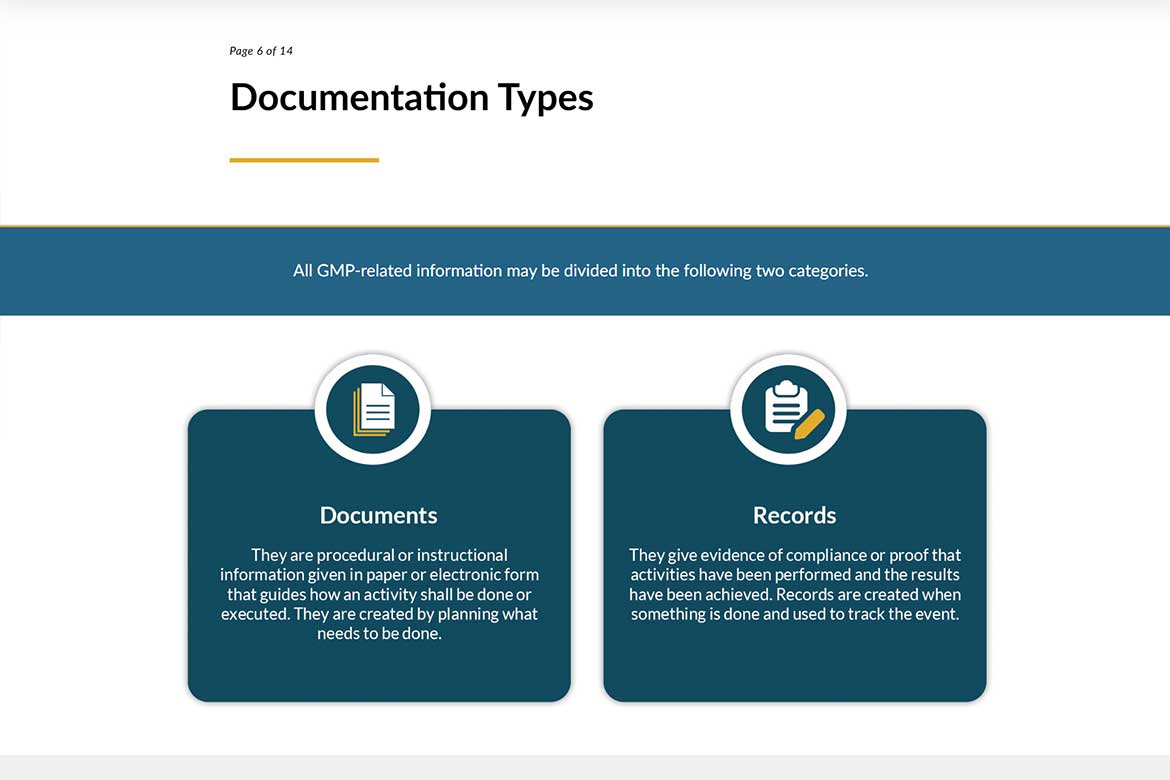 This Articulate Storyline module, crafted with strong instructional design, introduces learners to the fundamentals of GMP documentation. It clearly explains the difference between documents and records, outlines essential documentation for Production and Quality Control, and demystifies the purpose of the Site Master File. Learners also gain access to a practical checklist to ensure all required information is captured accurately and compliantly.